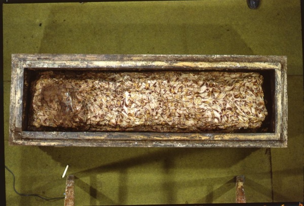 荊州馬山一號楚墓絲織品出土?xí)r的原貌。(荊州博物館供圖)