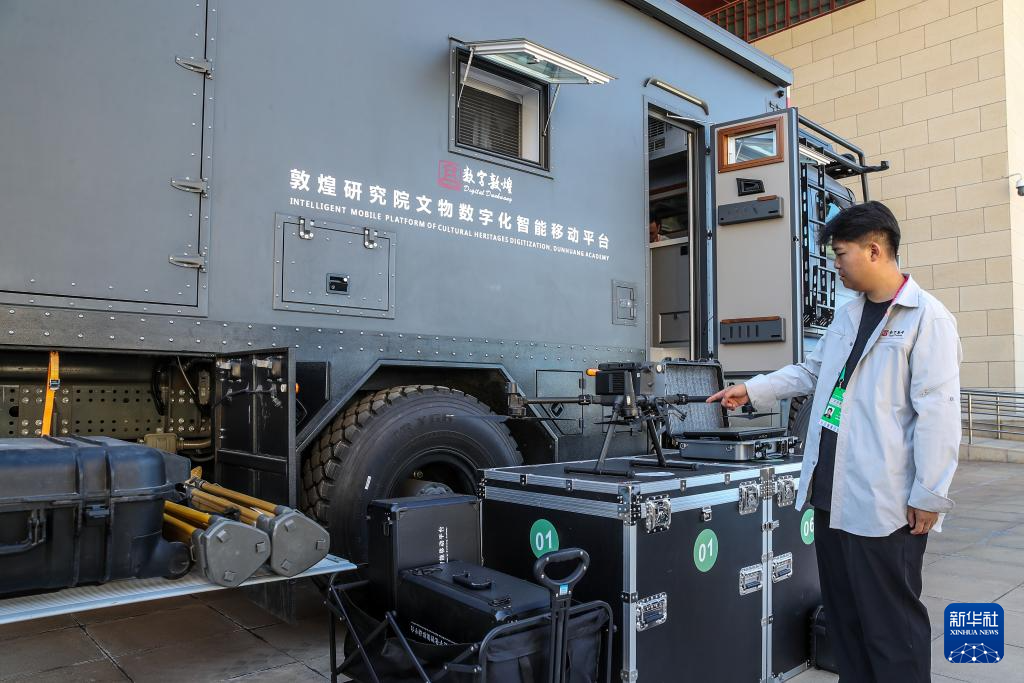 9月22日,在敦煌研究院“典范”“高地”建設(shè)成果展上,工作人員介紹敦煌研究院文物數(shù)字化智能移動平臺及其配套設(shè)備。