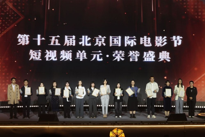 2025年4月25日,第十五屆北京國(guó)際電影節(jié)短視頻單元榮譽(yù)盛典在中國(guó)傳媒大學(xué)舉辦。這是獲獎(jiǎng)選手上臺(tái)領(lǐng)獎(jiǎng)。新華社記者 盧燁 攝