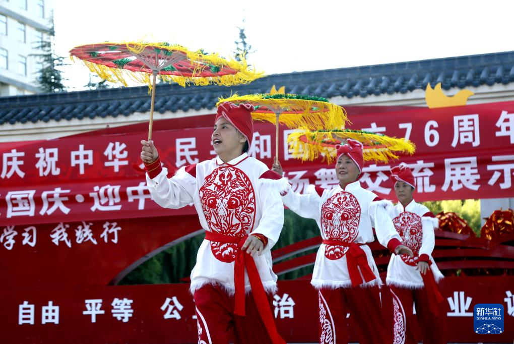 9月25日,在河南省洛陽市汝陽縣劉伶廣場,汝陽縣牡丹藝術(shù)團(tuán)在表演陜西大秧歌《紅歌大聯(lián)唱》。