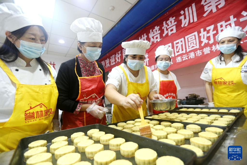 9月25日,在江蘇省連云港市譽(yù)林家政培訓(xùn)機(jī)構(gòu),連云區(qū)墟溝街道南巷社區(qū)居民學(xué)習(xí)制作月餅。