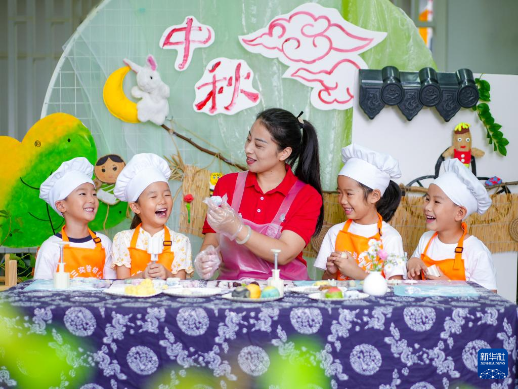 9月25日,在江蘇省泰州市姜堰區(qū)第三實驗幼兒園,小朋友們在老師的指導(dǎo)下學(xué)習(xí)做月餅。