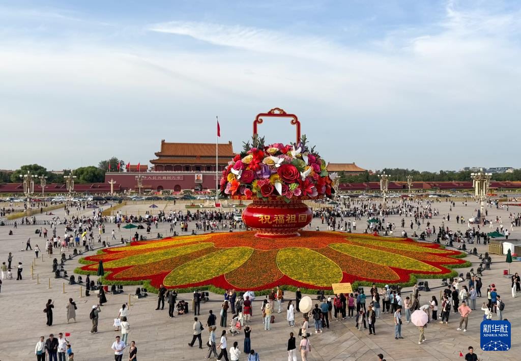 9月25日,2025年“祝福祖國”巨型花籃正式完工,亮相天安門廣場與市民共度佳節(jié)。今年“祝福祖國”花壇以喜慶的花籃為主景,花壇頂高18米,籃體高16米,籃盤直徑12米。籃體南側(cè)書寫“祝福祖國”“1949-2025”字樣,籃體北側(cè)書寫“歡度國慶”“1949-2025”字樣?;@內(nèi)選取了美好寓意的花卉,其中荷花寓意“和和美美”、橄欖枝寓意“榮耀和平”等,還結(jié)合和平鴿元素,體現(xiàn)“和平發(fā)展、欣欣向榮”。