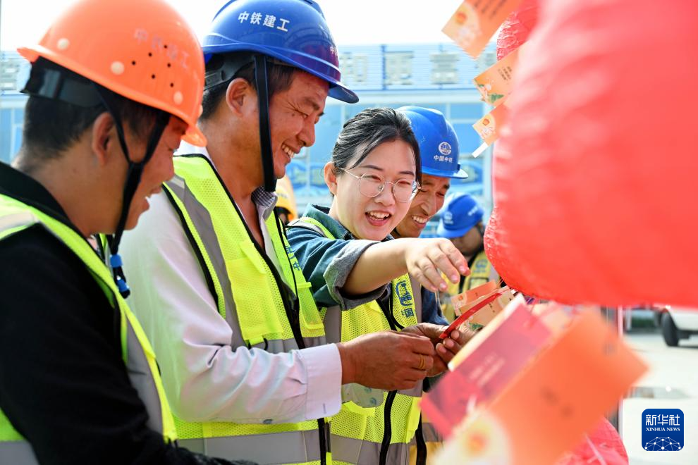 9月29日,工友們?cè)谥需F建工青島火車北站東廣場(chǎng)項(xiàng)目部迎國(guó)慶班組主題活動(dòng)上猜燈謎。
