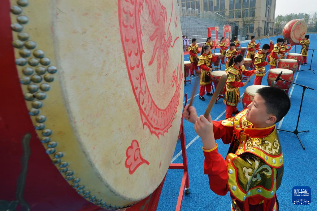 9月29日,在山東青島啟潤(rùn)實(shí)驗(yàn)學(xué)校舉行的迎國(guó)慶主題活動(dòng)中,學(xué)生表演鼓舞。