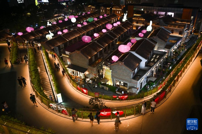 10月6日,市民在上海市虹口區(qū)濱港商業(yè)中心觀賞屋頂上的花燈。