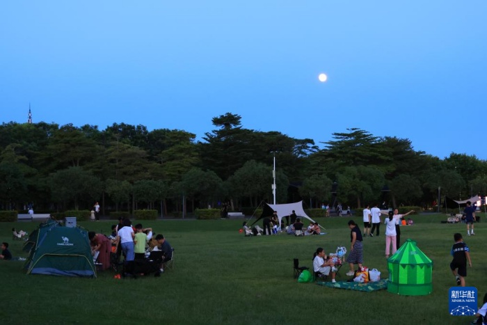 10月6日,人們在廣東深圳灣公園露營賞月。