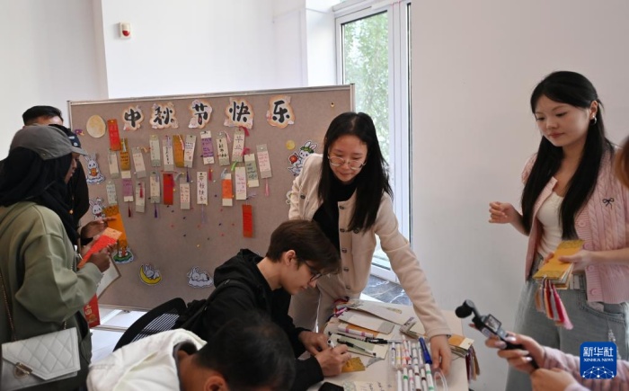 10月6日,在天津師范大學(xué)舉辦的“月圓中秋 情系中外——共赴文化奇妙夜”活動(dòng)上,中外學(xué)生在祈愿卡上寫下祝福。