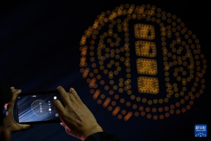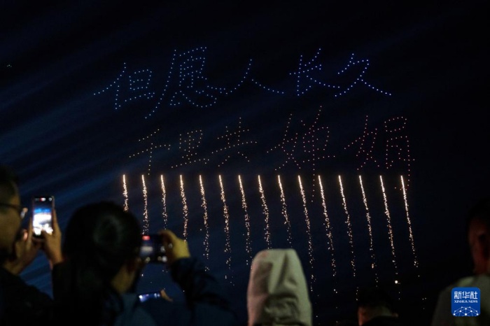 10月6日,人們在黑龍江哈爾濱冰雪大世界園區(qū)拍攝無人機(jī)表演。