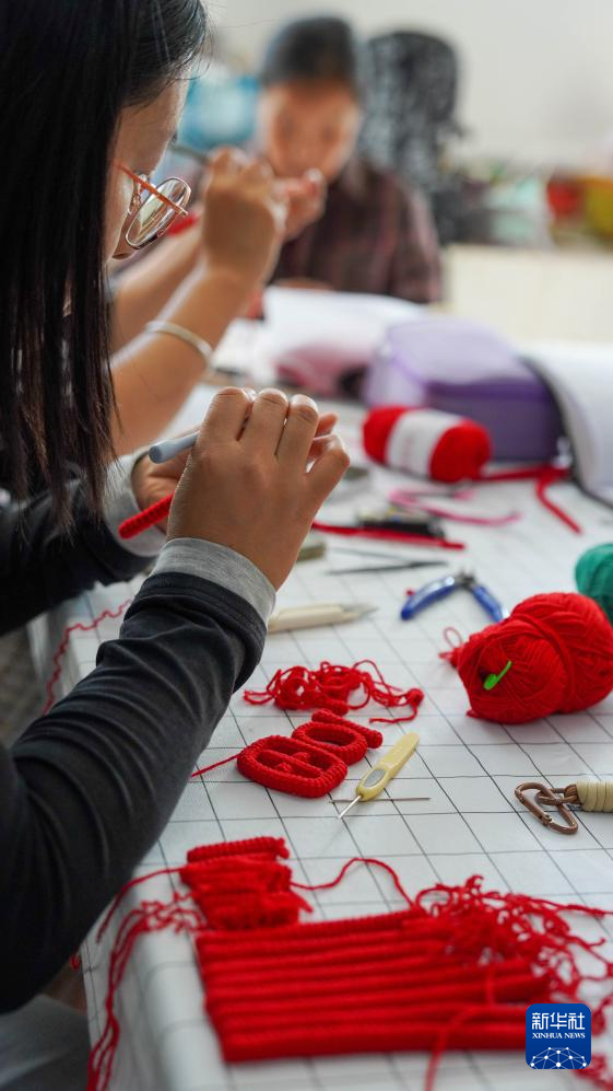 10月10日,手藝人在“春巧巧”婦女手工項(xiàng)目傳承實(shí)踐基地編織“福”字。