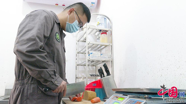 喂食竹子后,曾文開始準備精飼料了。當天的早餐飼料是胡蘿卜和饃饃,饃切塊、胡蘿卜切條。在盼盼園5號圈舍,大熊貓秀陽已經(jīng)等不及了,這只兩歲半的熊貓正處于成長期,在室外吃飽了竹子的秀陽回到圈舍等著投喂?;蛟S是等得久了點,他嘴里發(fā)出“咻咻”的叫聲,沿著圈舍走了兩圈才乖乖坐下。被投喂不過癮,秀陽伸出手掌作討要狀。這時,曾文就會哄它坐好,一塊投喂完畢后,再輕輕點一下秀陽的鼻子。這個親昵的動作語言仿佛是在說,“秀陽乖,吃得很好。”早餐定時定量投喂完畢后,秀陽便自個兒開始到戶外玩耍了。