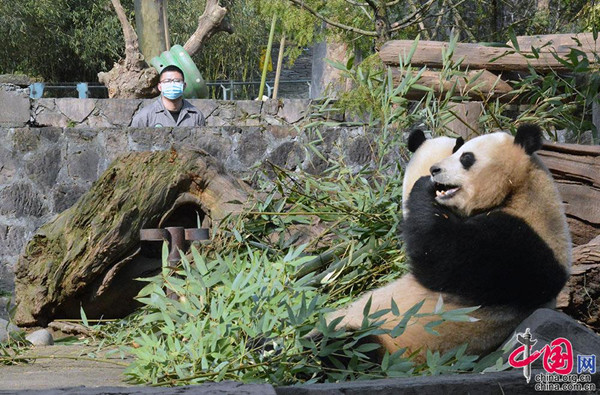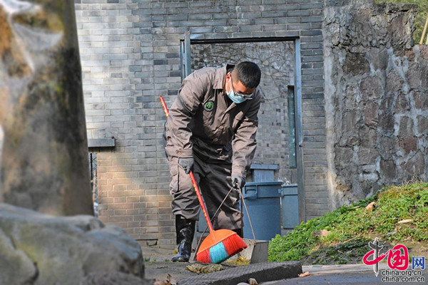 穿好工作服、雨靴,進入圈舍清掃。“清掃的同時還要仔細留意昨日采食情況、排泄情況,以及熊貓的精神狀態(tài)。”清掃完外舍,將新鮮的竹葉擺放好,這時,休息了一個晚上的大熊貓早已急不可耐。選個舒適的位置坐下,一手持竹,一手啃食,撕、扯、咬,再撕、再扯、再咬,有時是兩手共用、有時是四肢并用,在持續(xù)半個多小時的進食時間里,給了游客足夠的觀賞角度,其憨態(tài)可掬的萌萌樣引來了不少的贊嘆聲。