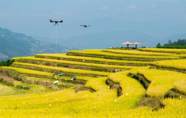 10月10日,湖北省秭歸縣沙鎮(zhèn)溪鎮(zhèn)長春村村民用無人機(jī)轉(zhuǎn)運(yùn)收獲的水稻(無人機(jī)照片)。新華社發(fā)(雷勇攝)