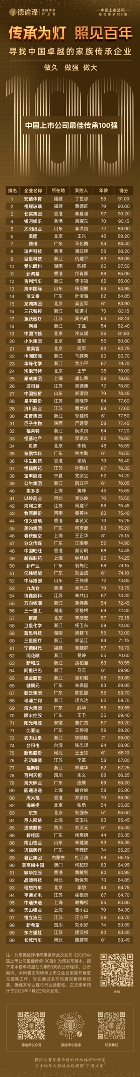 北京德諭澤律師事務(wù)所9月9日在北京預(yù)發(fā)布《2025 中國上市公司最佳傳承100強(qiáng)榜單》,阿里巴巴、寧德時(shí)代等科技巨頭位居榜單之列,排名緊隨安踏體育、福耀玻璃等傳統(tǒng)制造業(yè)。這給我們帶來什么啟示?